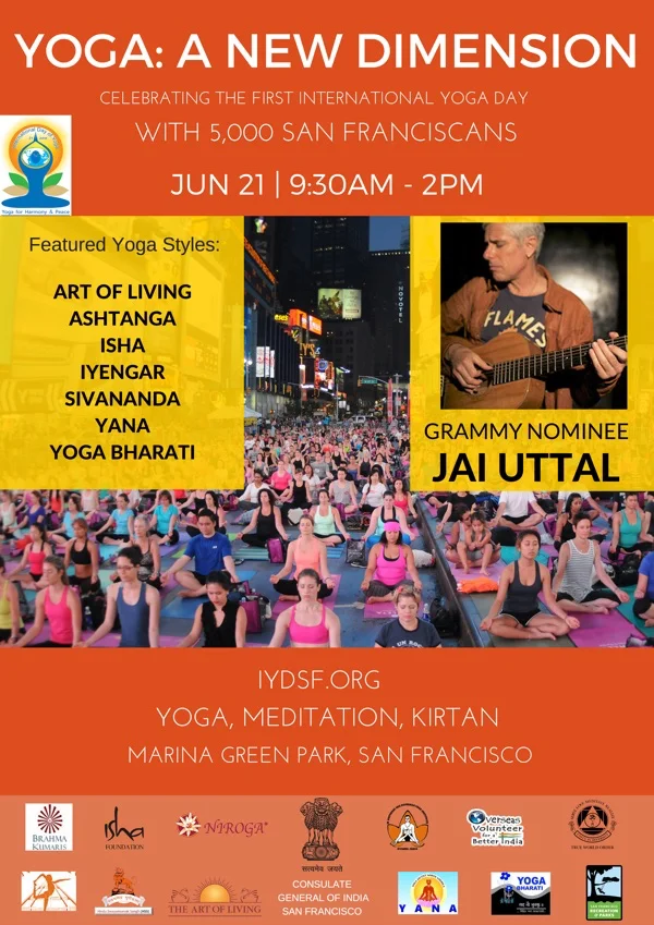 The Art of Living Foundation is partnering with several organizations including the Consulate of India SF, Brahma Kumaris, Isha Foundation, Iyengar Yoga Institute of San Francisco, Sivananda Yoga Vedanta Center, and Yoga Bharati to celebrate the first International Day of Yoga (IYD). This celebration will include Yoga, Meditation and Kirtan with Jai Uttal. Pradeep will be teaching the Common Yoga Protocol at 10:45.